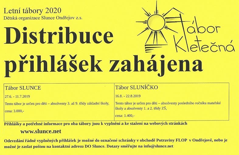 Přihlášky jsou ke stažení pouze na adrese www.slunce.net – v části Aktuální formuláře pro rok 2020 (Pravé boční menu dole).